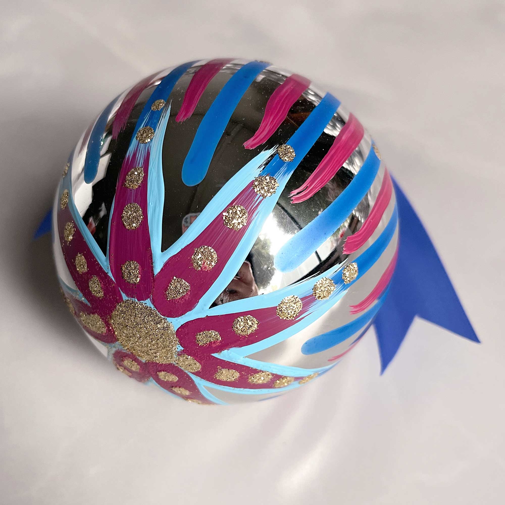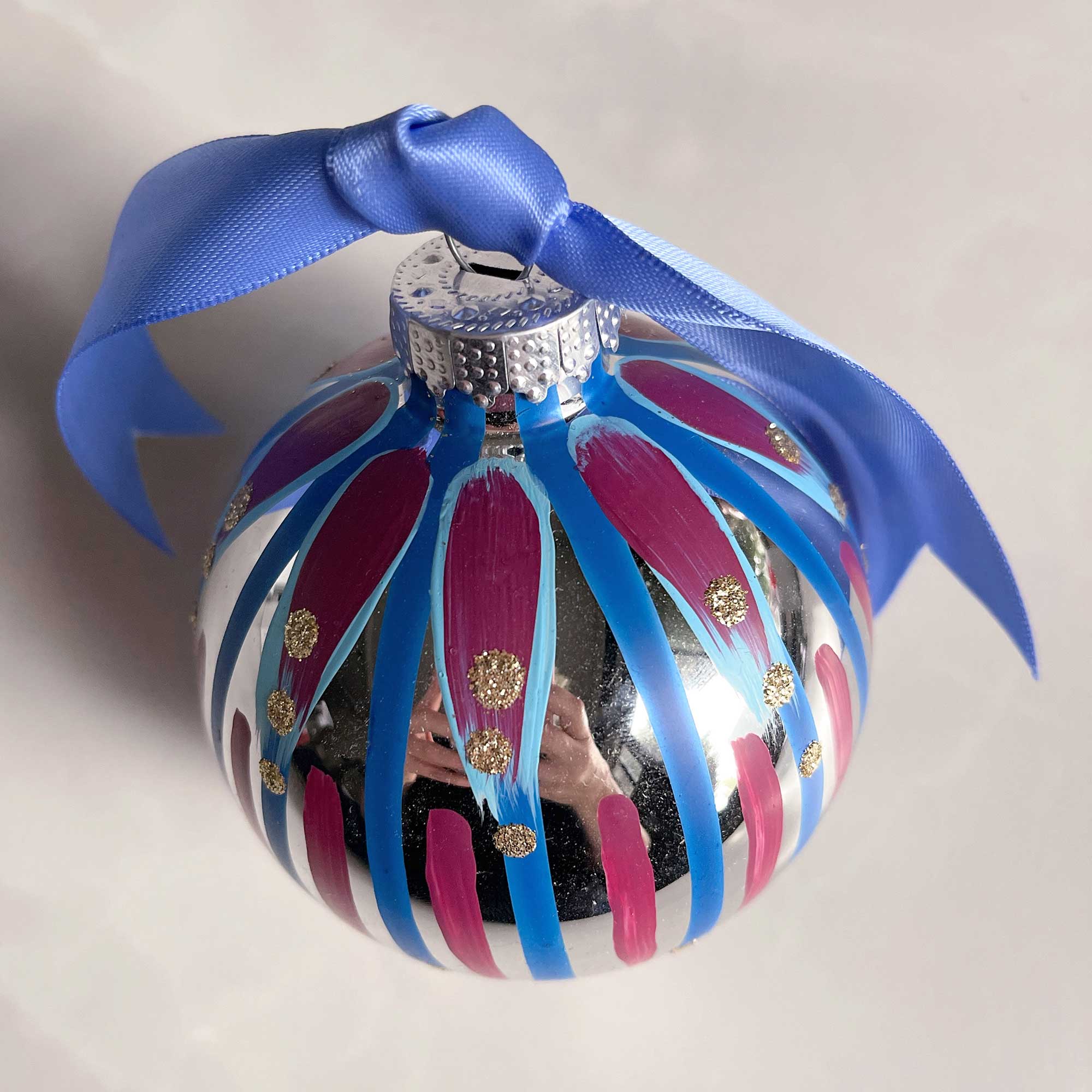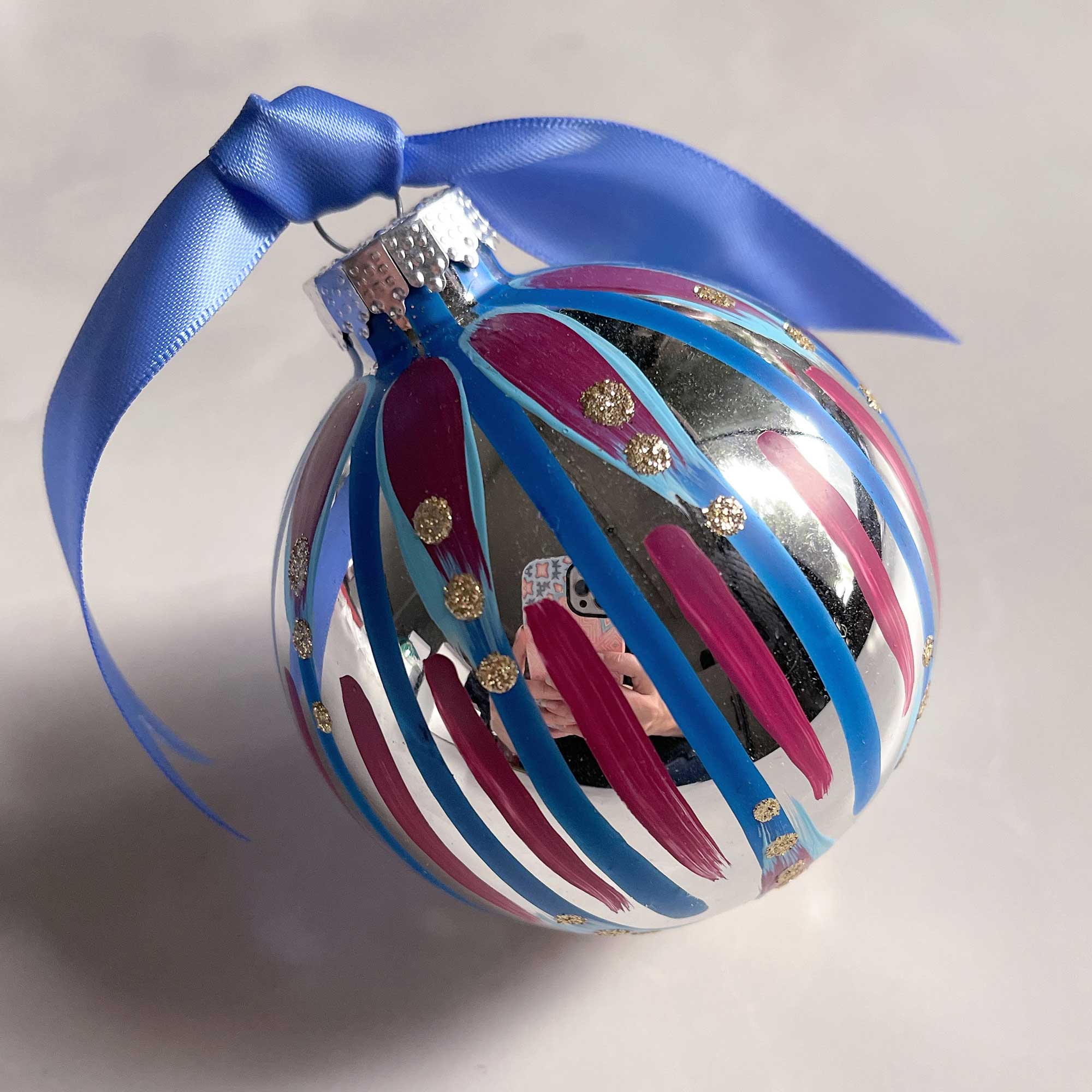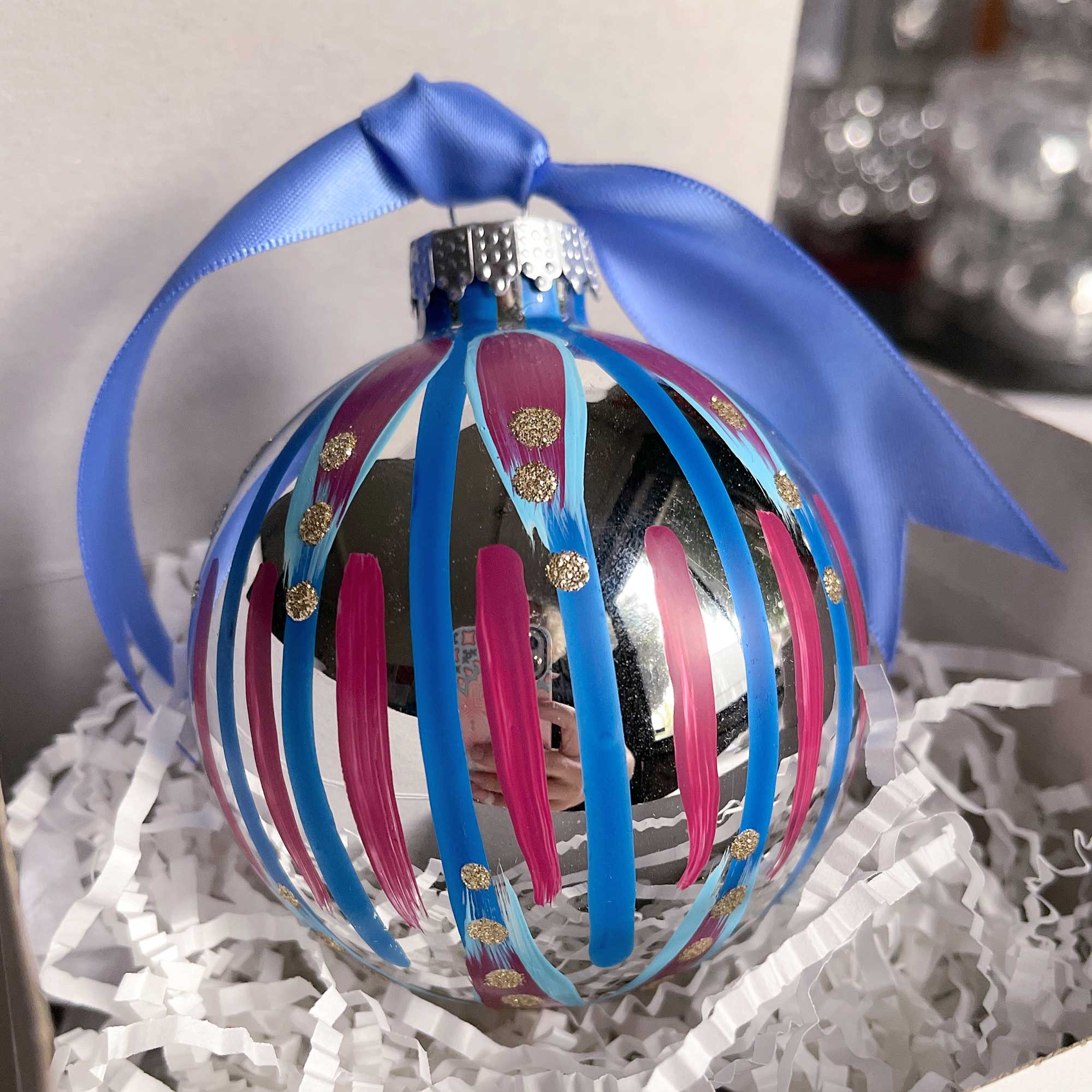 Our blue hand painted Christmas ornament for 2025, is a silver mirror, glass ball, surrounded with stripes of cobalt and aubergine with colorful brush strokes of sky blue. Shimmering dots of gold glitter dance under the lights of the Christmas tree and a periwinkle, satin ribbon completes the vision.