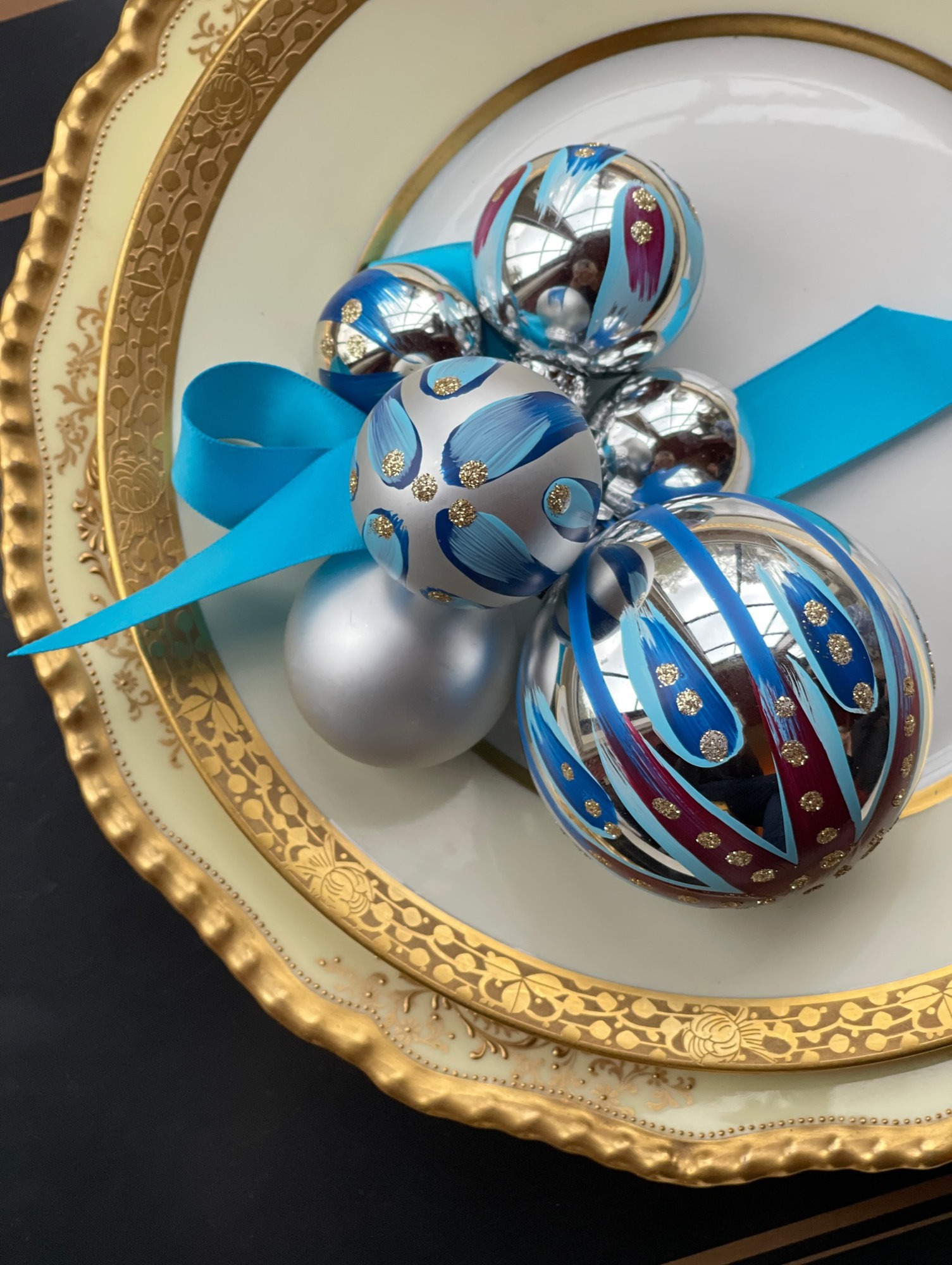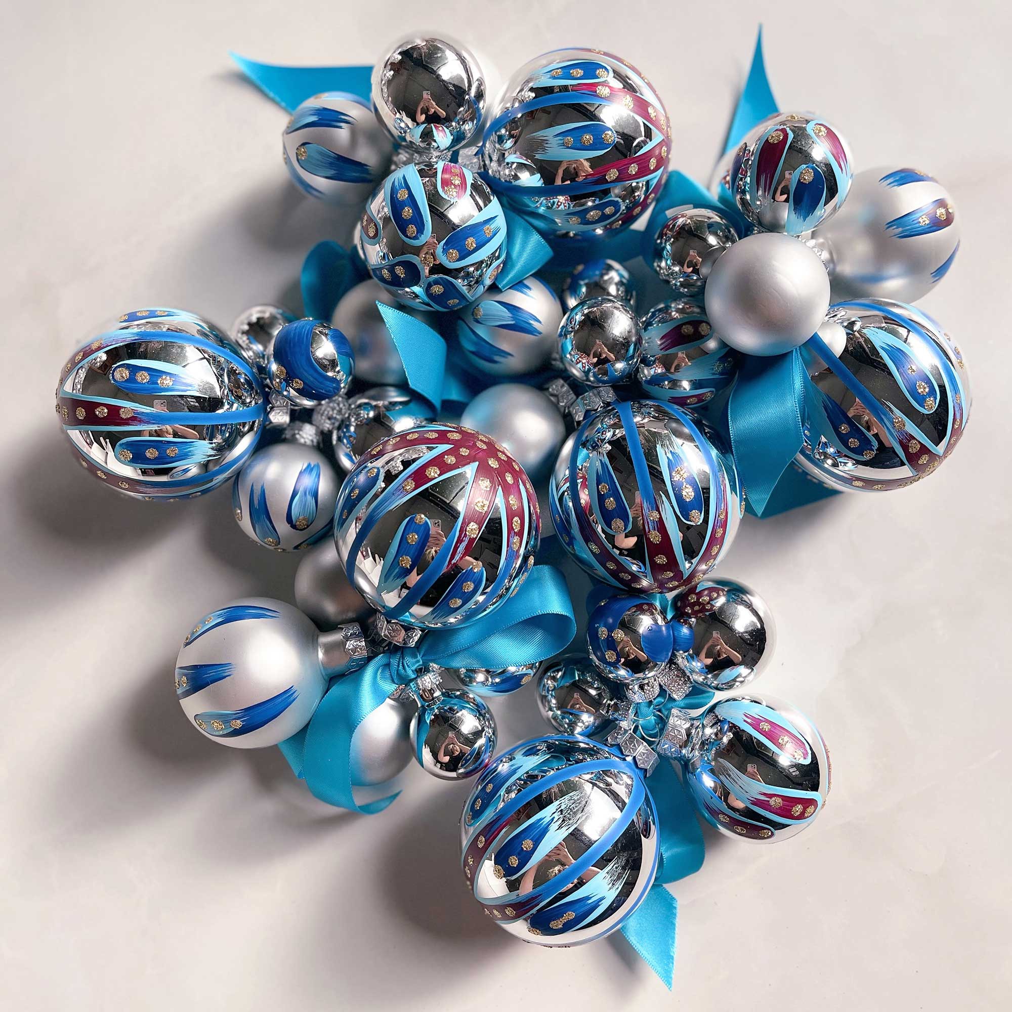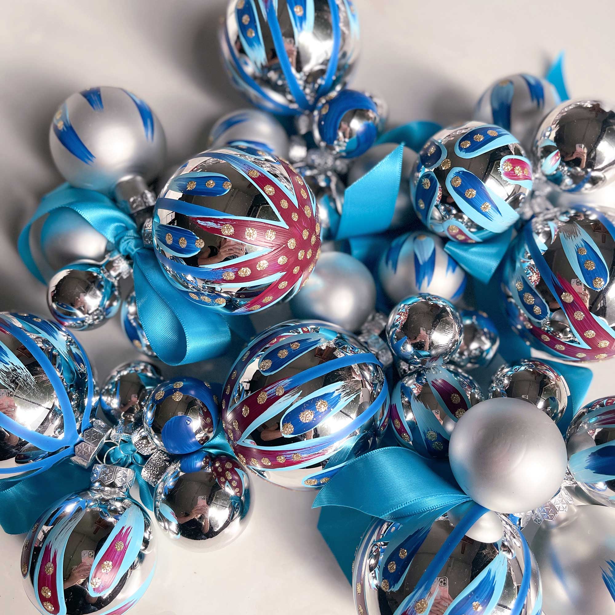 Each cluster features a unique collection of silver glass ornaments, painted with ribbons of cobalt and aubergine, and accented with sky-blue strokes and delicate gold glitter. Under candlelight or tree lights, the colors dance beautifully, adding a whisper of magic to your holiday table.