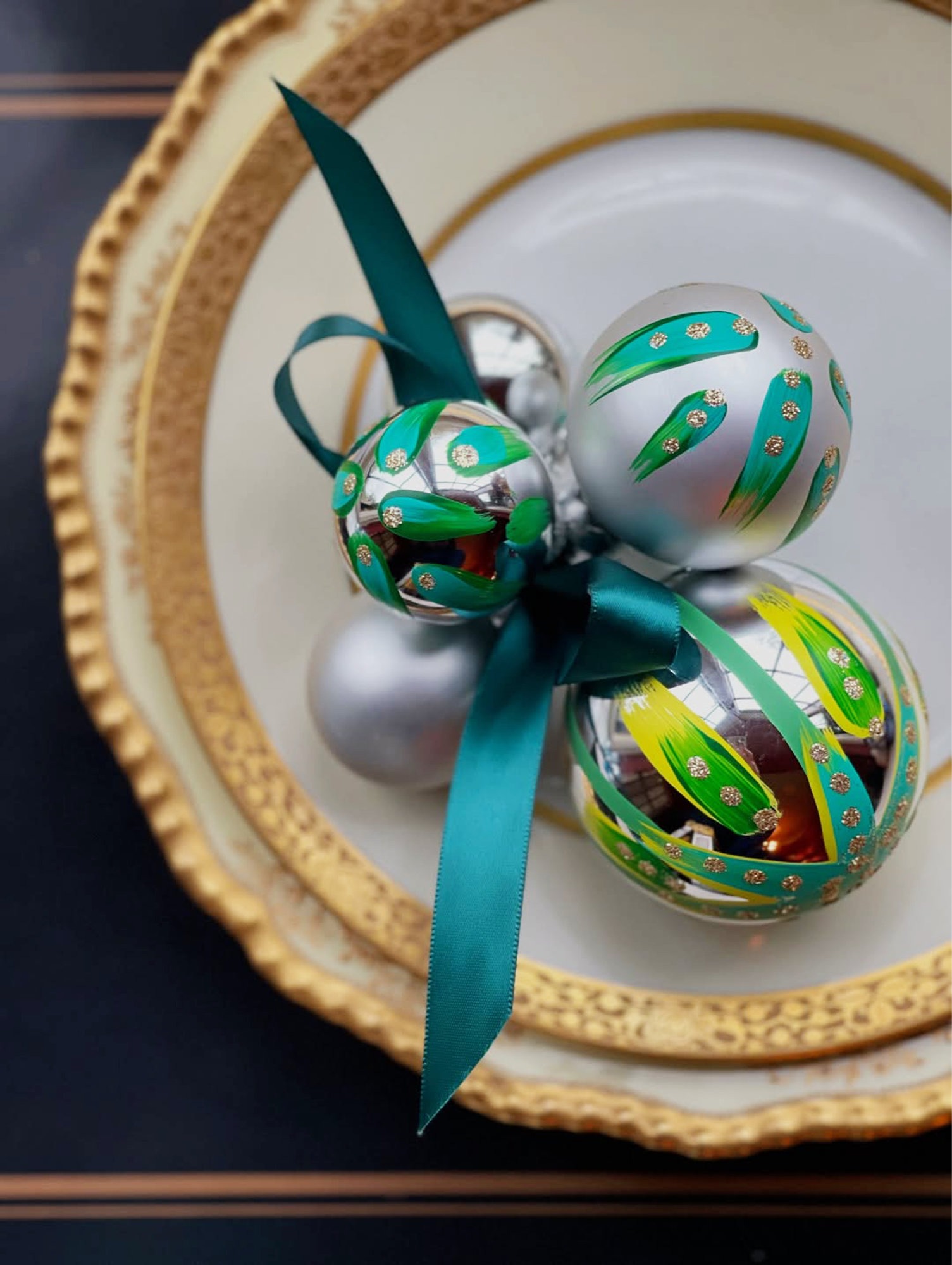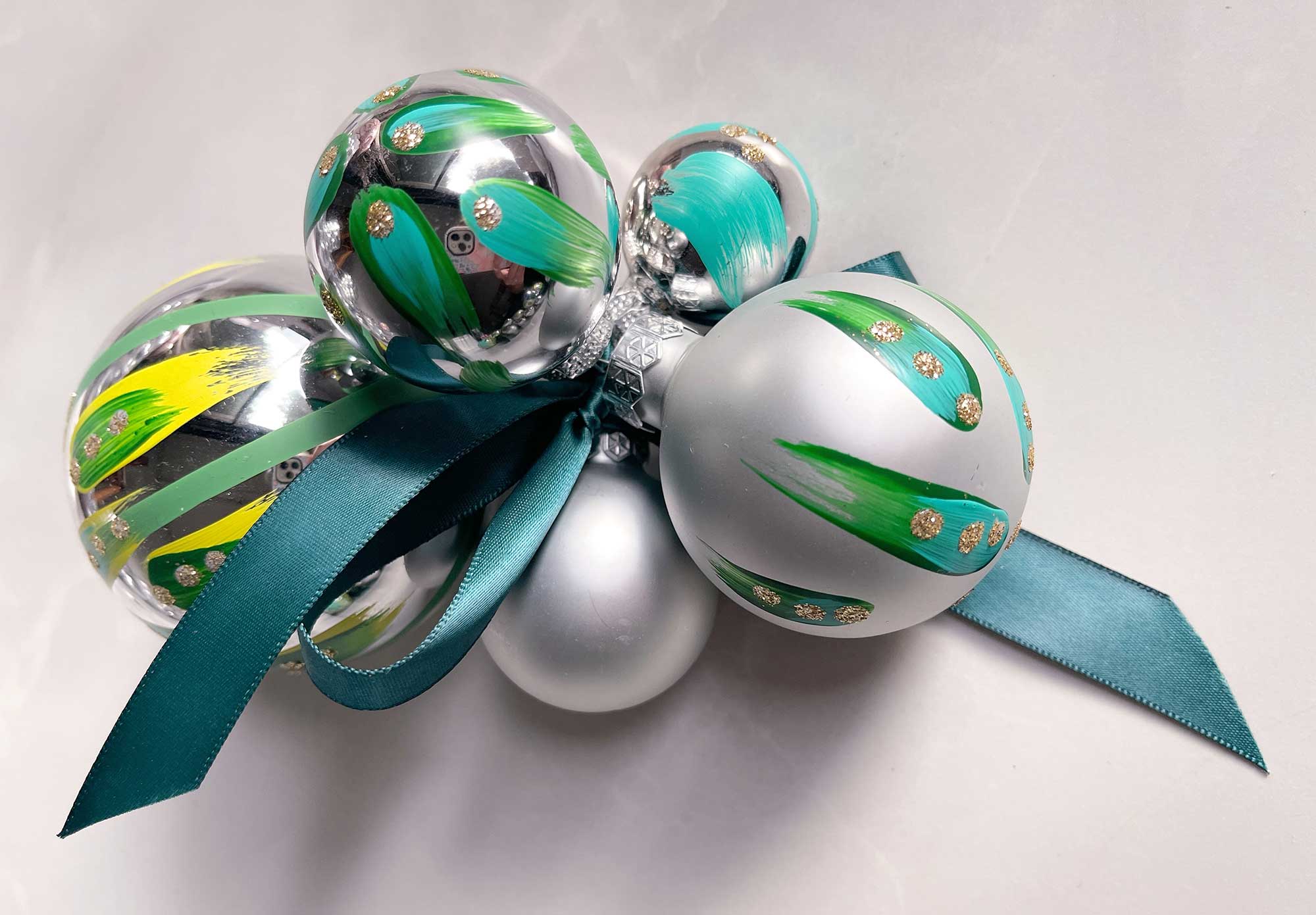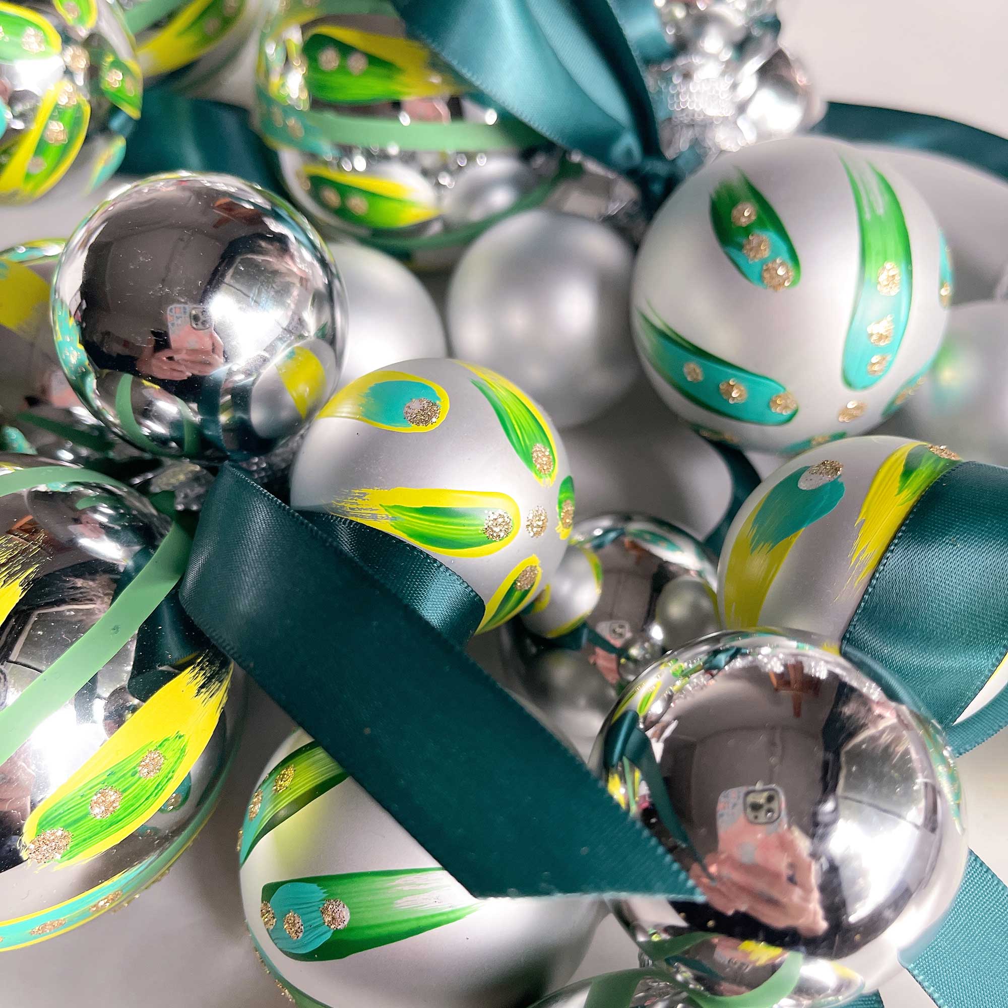 Each cluster features a unique collection of silver glass ornaments, painted with ribbons of aqua and green, and accented with bright yellow strokes and delicate gold glitter. Under candlelight or tree lights, the colors dance beautifully, adding a whisper of magic to your holiday table.