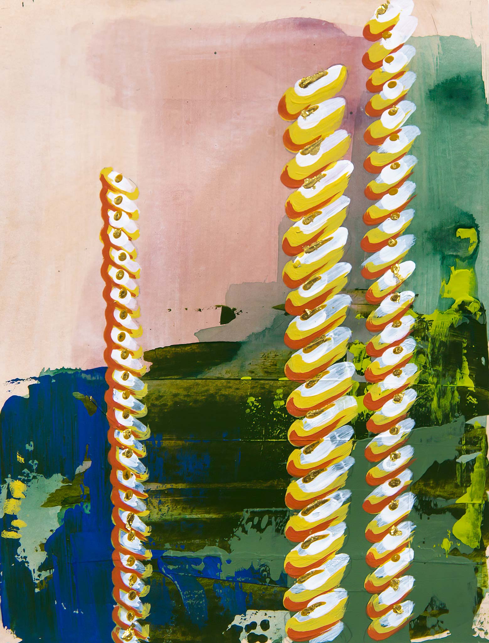 Abstract architectural painting by Teale Hatheway depicting a trio of vertical twisted rope torus moldings, rendered in layered brushstrokes of white, yellow, and terracotta with gilded highlights. Set against a richly painted background of blush, olive, and cobalt, the work reimagines classical decorative elements with bold color and painterly gesture.